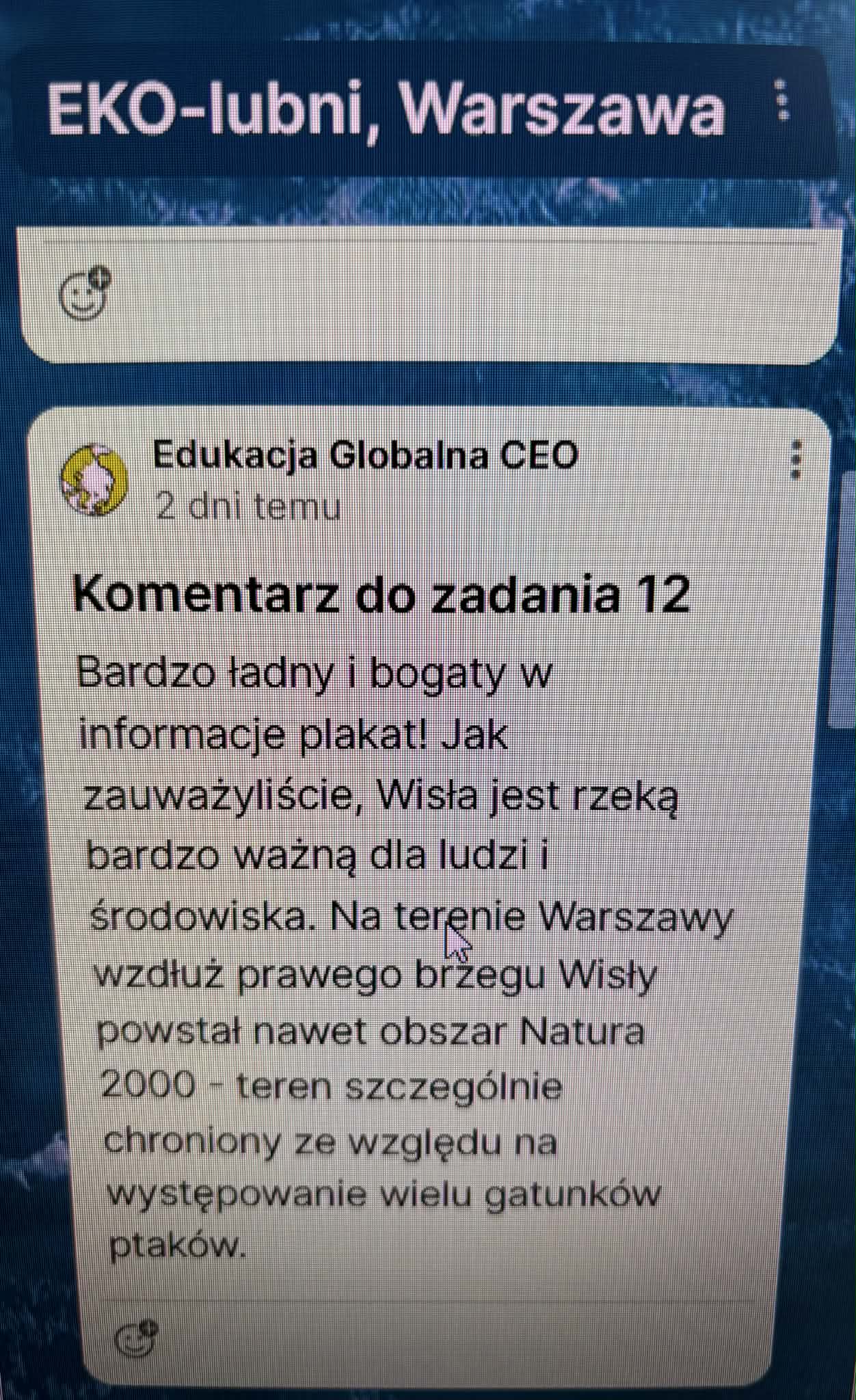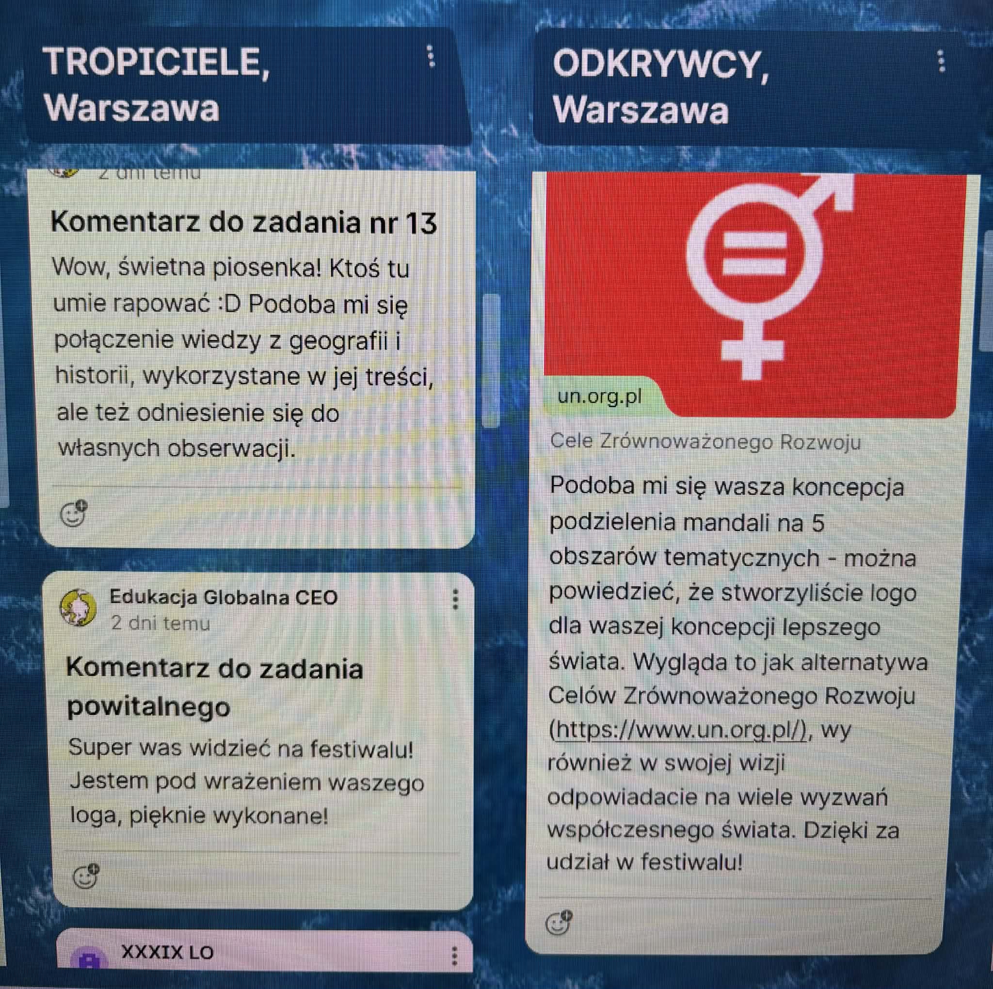 Na szczególną uwagę zasługuje opracowanie przez zespoły zadania końcowego w formie graficznej ,,Nadzieja na lepszy świat” oraz stworzenie utworu muzycznego i poetyckiego o tematyce ekologicznej. Rozwiązując te zadania, uczniowie wykazali się dużą fantazją, pomysłowością i wyobraźnią. Jedno jest pewne – chcą zmieniać świat ! Warto przytoczyć w tym miejscu ich wspólne motto zapisane na Padlecie ,, Możemy zmienić świat, bo jesteśmy aktywni, kreatywni, stajemy w obronie słabszych, wykluczonych, na co dzień dbamy o dobro natury i chcemy, aby na całym świecie zapanował pokój”.